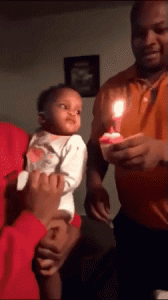 Baby blow out the candle with his hand